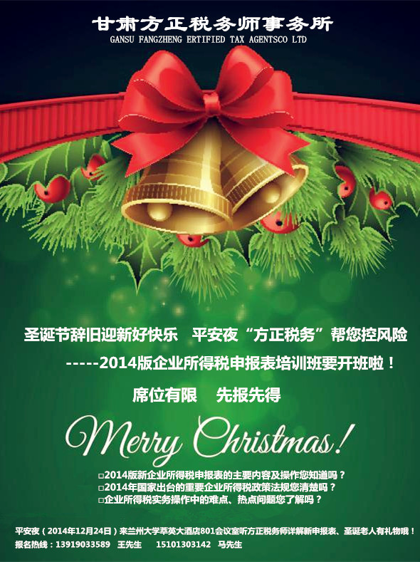 2014年12月24日,又一个平安夜。兰州与世界一样洋溢着节日的氛围,大街小巷到处是苹果和鲜花,方正税务师在这一天也给纳税人送上了一份祝福,2014年度所得税汇算及新表首期讲座如期举办,祝纳税人:平安纳税,防范风险。