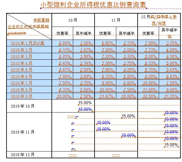 15%×(2015年10月1日之后经营月份数/2015年度经营月份数),同时填入本表第3行“其中:减半征收”。为简化计算,企业可以按照《小型微利企业所得税优惠比例查询表》(附件第三部分)计算填报该项优惠政策。