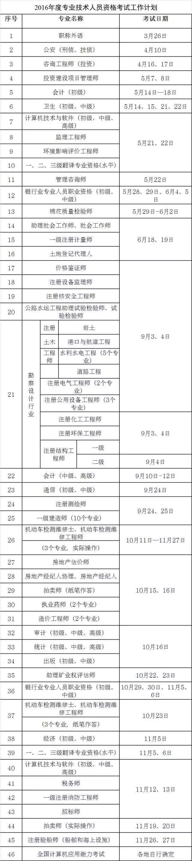 一、请按照《2016年度专业技术人员资格考试工作计划》(见附件),做好考试组织实施工作,确保各项考试工作安全顺利进行。如遇特殊情况需要变更考试日期的,将提前另行通知。未列入该年度考试工作计划的其他专业的考试日期,待确定后另行通知。