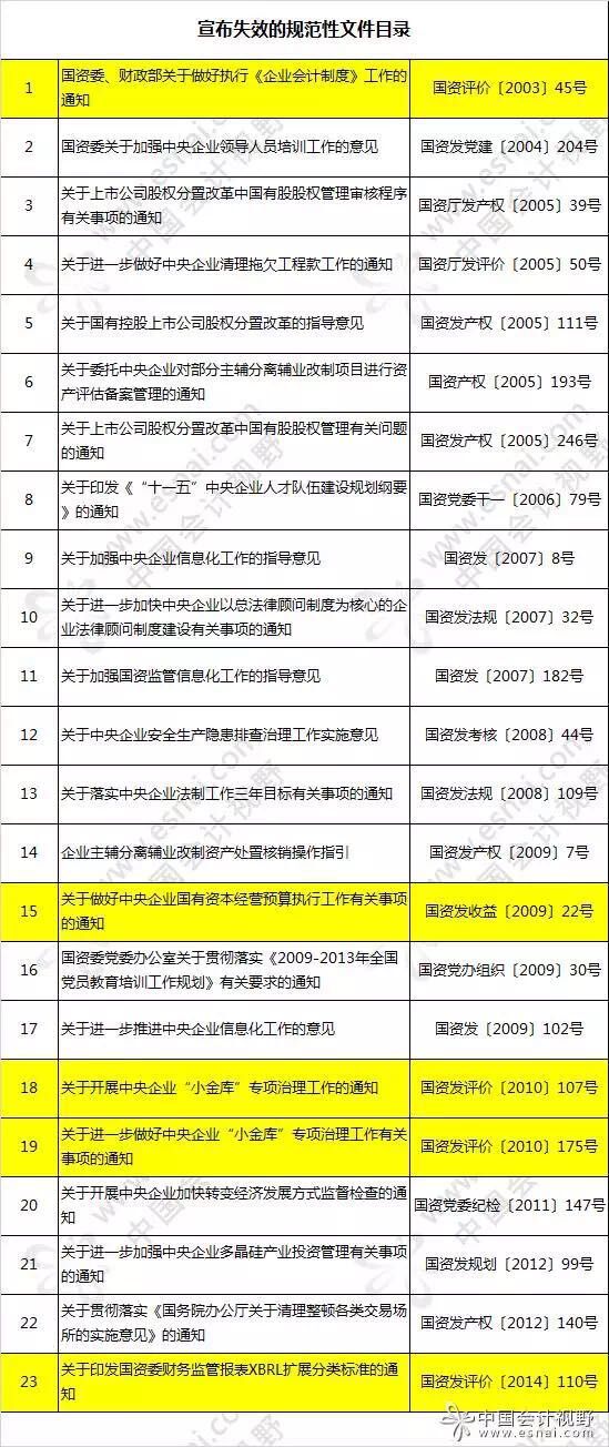 公告称,根据党的十八届三中、四中全会精神,为落实以管资本为主加强国有资产监管的要求,深入推进依法监管,国资委对现行有效规章、规范性文件进行了清理,决定废止和宣布失效部分规范性文件。并将废止和宣布失效的规范性文件目录予以公布。