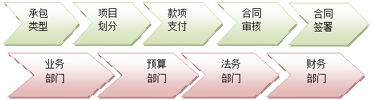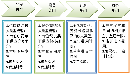 涉及的部门包括主管对下计价工作的部门、主管物资采购的部门、主管设备采购与租赁的部门、财务部门、办公室等,具体如下图:
