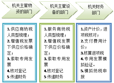 机关层面确认进项税额涉及的部门及其工作如下图所示