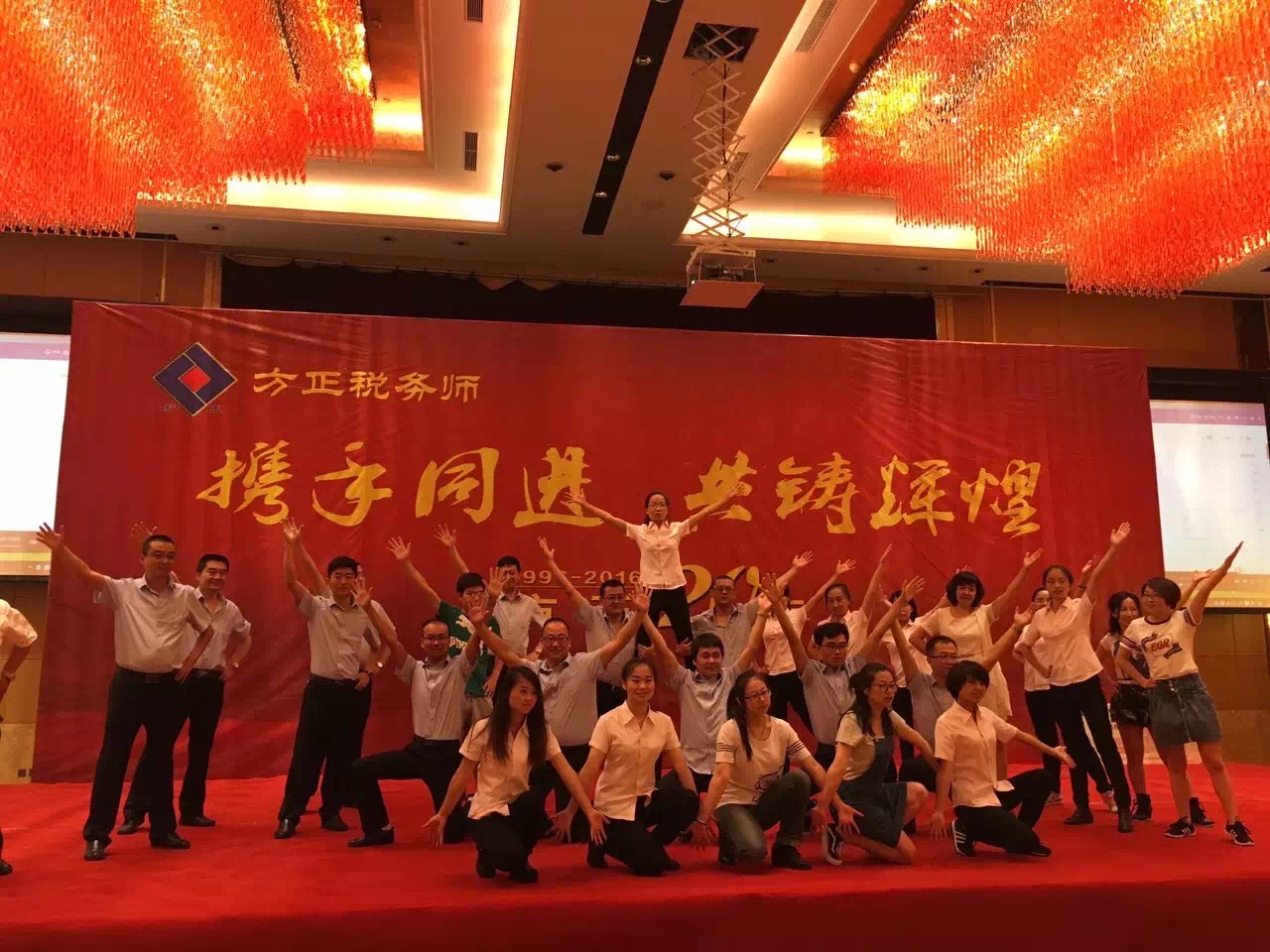 下午四点三十分,随着主持人十秒倒计时,庆典正式开始,第一主题为方正风采展示,一段《放飞梦想》的影片将方正人20年的发展历程展现得淋漓尽致;诗朗诵《追逐梦想》真情诉说了方正人艰辛创业、奋发向上的企业精神,相同的梦想激励着方正人一路前行;一段《税虫诞生记》的动漫片反映了方正人刻苦钻研、一丝不苟、业务传授、专业服务的工匠精神;活力的《方正小苹果》将现场气氛推向了高潮。