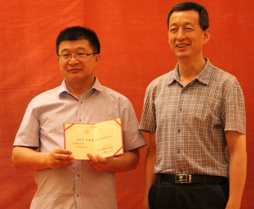 甘肃省注册税务师管理中心副主任朱晓宁(右)为方斌国所长颁发《中国注册税务师协会财税专家库专家证书》