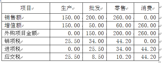 例如,某项商品最终销售价格为260元,这260元是由三个生产经营环节依次创造,假设第一各生产环节为原头企业,没有可抵扣的外购项目,依次经过了批发、零售,到了消费者的手中,如果适用税率为17%,所反映数据均为不含税。具体数据资料如下表: