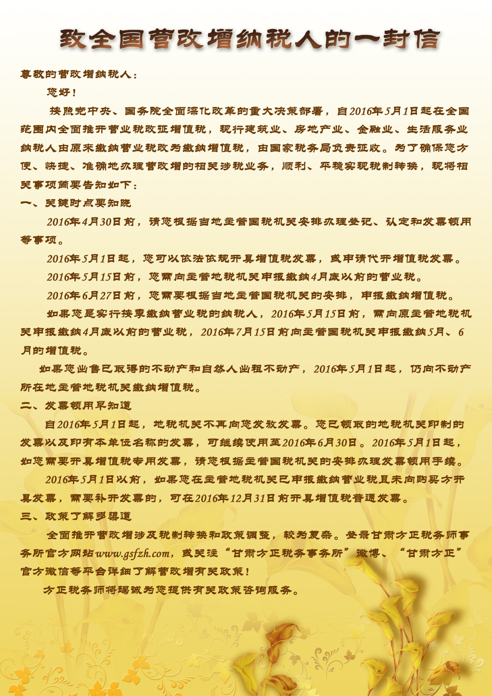 全面推开营改增涉及税制转换和政策调整,较为复杂。欢迎您积极参加当地税务机关组织的免费政策培训和辅导,尽快掌握和熟悉营改增政策及征管操作流程。如果您想详细了解营改增有关政策,请您登陆国家税务总局网站(网址:www.chinatax.gov.cn),或拨打12366纳税服务热线,或关注“国家税务总局”微博、微信和客户端,(亦可登录甘肃方正税务师事务所官方网站www.gsfzh.com,或关注“甘肃方正税务事务所”微博、“甘肃方正”官方微信)或到当地国税机关办税服务厅咨询,我们将竭诚为您提供有关政策咨询服务。
