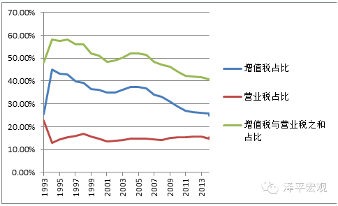 自分税制改革以来增值税、营业税额迅速增长,分别成为我国第一大、第三大税种,从1994年的2308亿、670亿增长至2015年的31109亿、19313亿,分别增长13倍和29倍,两项税收之和达到5万亿,占税收收入40%。从增值税、营业税占税收收入的比重看,营业税占比从13.07%略有上升至15.46%,增值税占比从45.02%下降为24.91%,主要由于企业所得税、个人所得税、消费税占比的提高。