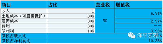 根据房地产行业一般情况数据,假定土地成本、建安成本、费用、净利润各占30%、30%、30%和10%。从近年来房地产行业的净利润率来看,10%左右是符合现实的。分两种情况考虑,假设建安成本100%可取得进项税抵扣票据,则实际税率为3.96%,减税规模占收入比为1.04%,将提高净利润10.36%,极大提高房地产业净利润。假设建安成本50%可取得进项税抵扣票据,则实际税率为5.45%,比原营业税条件下的税率提高0.45%,将降低净利润4.5%,房地产净利润将缩减一半。因而,对于具体企业是否最终能够获得减税取决于增值税票据的管理。