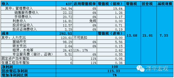 以基金业为例测算营改增的可能影响,根据中国基金业协会数据,2014年基金行业收入437亿,将收入分成细项,其中利息收入不属于增值税征税范围,故不产生增值税销项税;人力支出不可抵扣;假定营销开支全部可取得抵扣票据;租赁、水电未做进一步拆分,以可抵扣较少进项税的方式计算,假定能够全部获得进项税额抵扣凭证;假定营销支出能够全部获得进项税额抵扣凭证;固定资产、在建工程当年增加由可抵扣进项税,且第一年可抵扣60%,第二年抵扣40%,按照60%的年度可抵扣金额计入进项税。从结果看,“营改增”将增加净利润的7%。