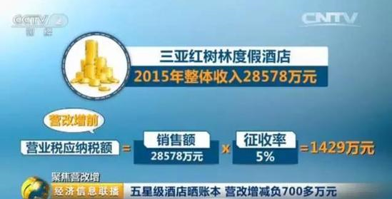 举例来看,该集团旗下三亚红树林度假酒店在2015年整体收入为28578万元,营改增前,营业税应纳税额为(销售额28578×征收率5%)1429万元。