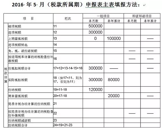 3. 主表第19 栏“应纳税额”“一般项目”列“本月数”=第11 栏“销项税额”“一般项目”列“本月数”-第18 栏“实际抵扣税额”“一般项目”列“本月数”-第18 栏“实际抵扣税额”“一般项目”列“本年累计”。即:500000-300000-80000=120000