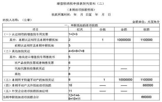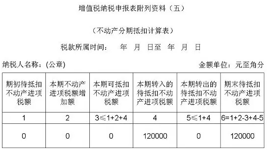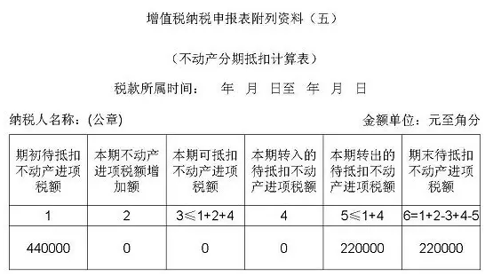 适用分期抵扣的不动产进项税额,60%的部分于取得扣税凭证的当期从销项税额中抵扣;40%的部分为待抵扣进项税额,于取得扣税凭证的当月起第13个月从销项税额中抵扣。在附表五第2列“本期可抵扣不动产进项税额”和附表二第10栏“本期不动产允许抵扣进项税额”中反映。详情【填写案例三】