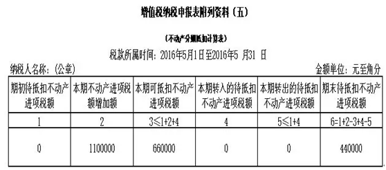 业务分析:根据不动产抵扣相关规定,110 万元进项税额中的60%将在本期(2016 年5 月)抵扣,剩余的40%于取得扣税凭证的当月起第13 个月(2017 年5 月)抵扣。