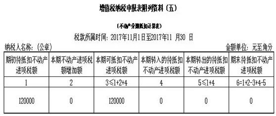 第五步:填写《增值税纳税申报表附列资料(五)》(不动产分期抵扣计算表)。(有不动产进项税额分期抵扣业务的纳税人填写)